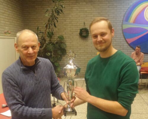 Klokslag 12 uur verrichtte wedstrijdleider Willem de Wilde de prijsuitreiking van een meer dan geslaagde schaakavond, die tot in de puntjes door hem werd verzorgd. Als dank ontving Willem van voorzitter Egbert Aalbers een attentie en een warm applaus van de aanwezigen. Nadat Egbert iedereen had bedankt voor hun aanwezigheid en een ieder fijne feestdagen had gewenst, keerden alle schakers met een tevreden gevoel huiswaarts.