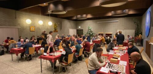 De partij tussen de met wit spelende Ruben de Vries en Mark Bakker eindigde in een puntendeling. Helaas hebben we geen verslag van hen mogen ontvangen.