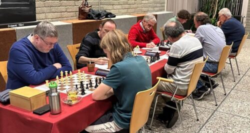 Met zwart speelde Ben Zee tegen Dick Wenning, er kwam een Franse verdediging op het bord. Dick startte met b4 een mooie aanval, maar dit ging gepaard met de nodige risico’s. Hierna ging de partij beiden kanten uit, van een loperwinst die enkele zetten later weer verloren ging ontstond een gelijkwaardig partij. Er werd tot remise besloten wat beide spelers een prima uitslag vonden.
