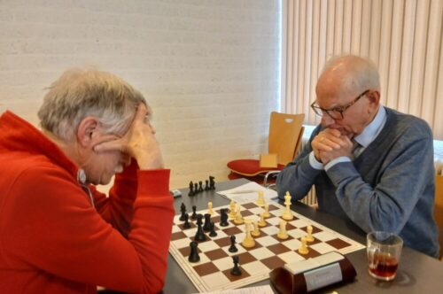 De jarige Kees van der Dussen en Tom Smit speelden de langste partij van de middag! Het werd een boeiende en spannende partij. Pas in het verre eindspel wist Tom zijn iets betere positionele stelling om te zetten naar winst.