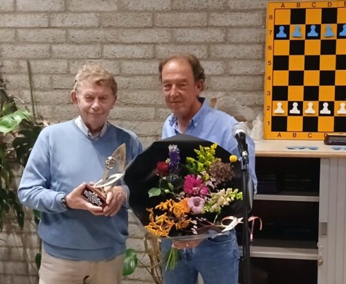 Egbert Aalbers heette iedereen welkom en blikte terug op het seizoen. De kampioenen van al onze competities zijn bekend. We kunnen wel stellen dat dit het jaar van Marnix Lukasse is geworden. Zowel in de beker als in de interne competitie was Marnix de winnaar, een bijzonder mooi resultaat. Daarnaast viel het op dat de vaders er nog maar net in slaagden om boven hun zoons te eindigen. Een uitdaging voor Ruben (de Vries) en Jim (Pronk) om daar volgend seizoen verandering in aan te brengen. Verder was het opvallend is dat in de top twaalf van de interne competitie maar liefst zes zelf opgeleide jeugdspelers zijn geëindigd, een prachtig resultaat waar we trots op mogen zijn. Ook extern werden mooie successen geboekt zowel in de SOS als in de KNSB competitie. Ook hele mooie individuele resultaten, zoals bijvoorbeeld de TPR van 2279 in de SOS competitie van Dominic van Dijk. Maar het belangrijkste is dat er enthousiast, fanatiek en met veel plezier geschaakt is. Vanavond de slotavond van een mooi seizoen, maar de komende vier weken wordt nog de Rapid competitie gespeeld. Tot slot gaf Egbert aan nog te willen stil staan bij een ander slot en hij vroeg Ben Zee naar voren te komen.